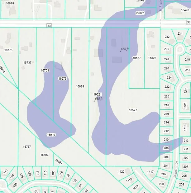 Map showing areas of wetlands within proposed project as determined by the Lake County Wetland Inventory (LCWI). Some of these areas are impaired from decades of farming but may still possibly contain features that could enable restoration.