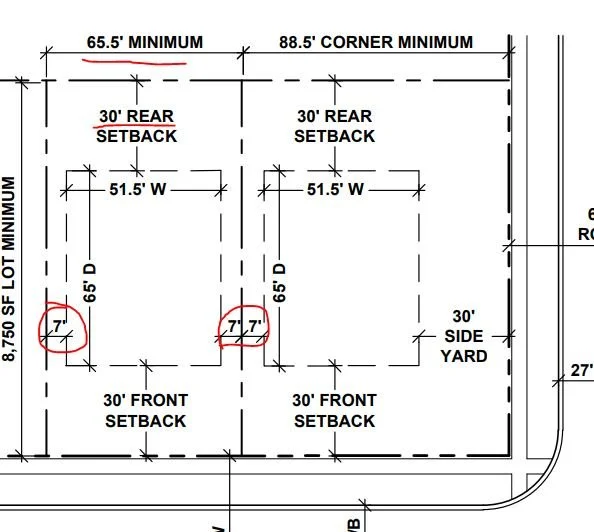 Proposed lot layout. Note the smaller rear setback (30 feet vs 40 feet in Old Farm Village), the minimal spacing between homes (only 14 feet), and the narrow lot size (65.5' vs 80' in Old Farm Village).