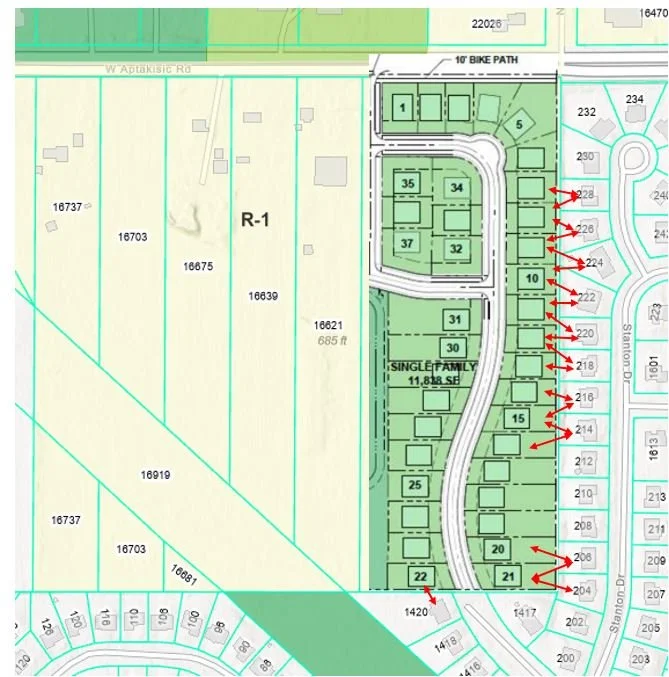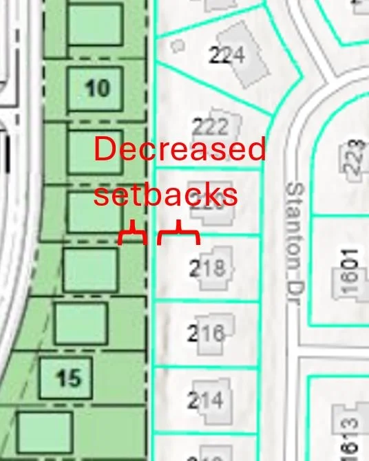 R-7 zoning allows for lots with reduced widths. Neighbors along Stanton drive will not have just one home facing them, but may have two or more.