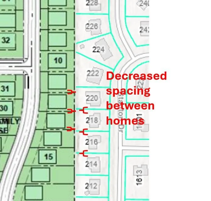 Homes would be spaced 14' apart versus the nearly 28' homes are currently spaced in Old Farm Village. This density would dramatically change the aesthetic of Old Farm Village